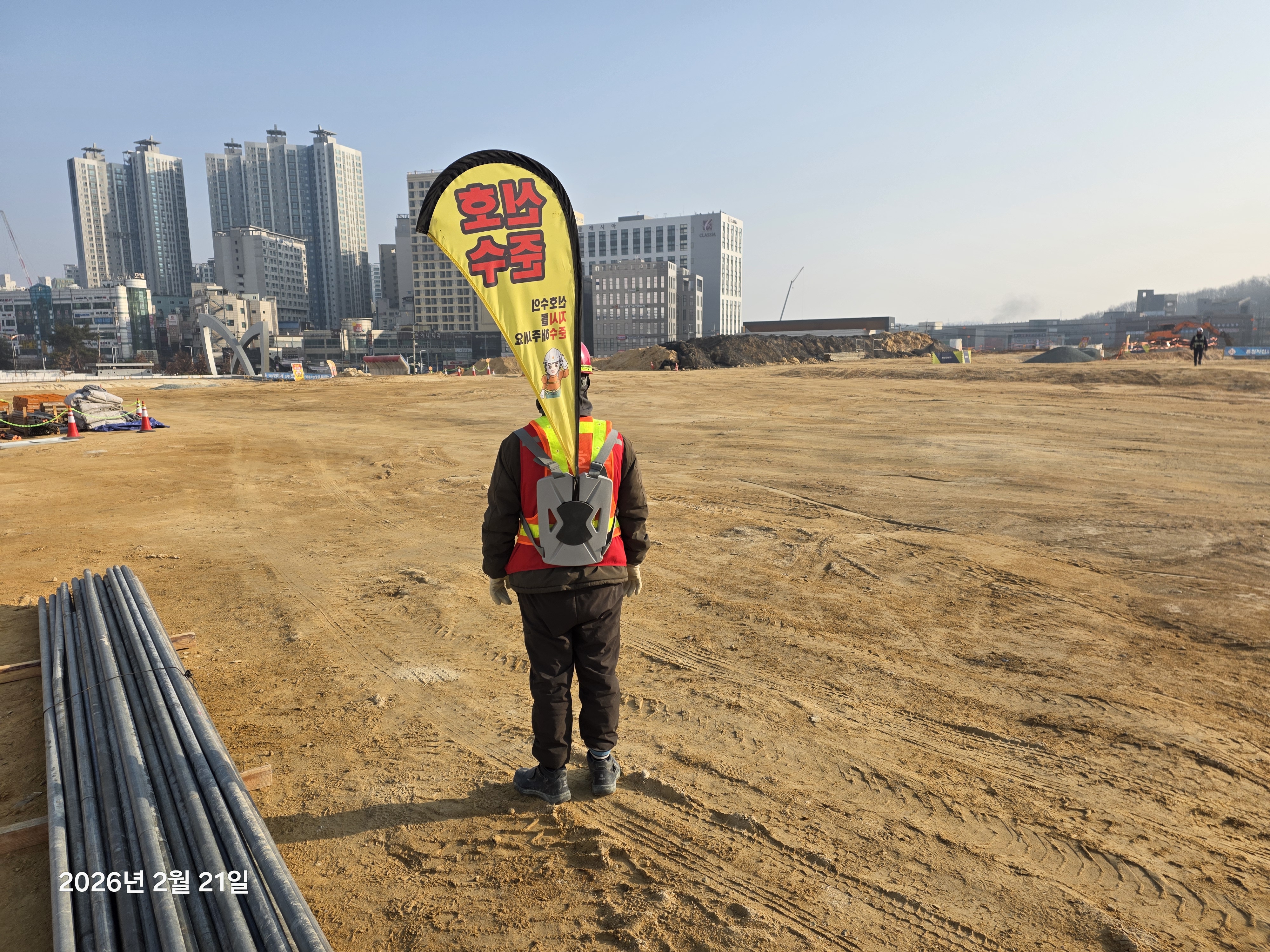 크레인 양중 작업이나 차량 통행이 빈번한 곳에서 **일정한 신호(수신호, 무전)**를 보내는 역할입니다.